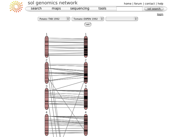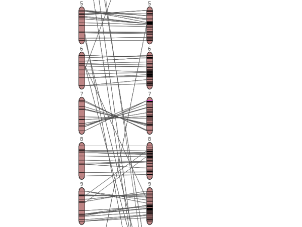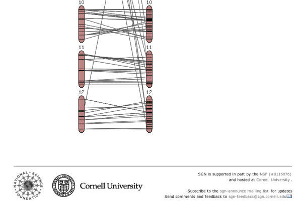 Clicking on one of the chromosome glyphs on the overview page will bring up the chromosome view. In this view, a chromosome is displayed in its entirety, but most of the marker names will be hidden because on most maps there are too many markers to be displayed. To see all the markers, the map can be zoomed into by clicking on a point of interest. This will bring up a zoomed-in view alongside the chromosome. The chromosome can also be compared to another chromosome of another map by choosing a comparison chromosome from the list.