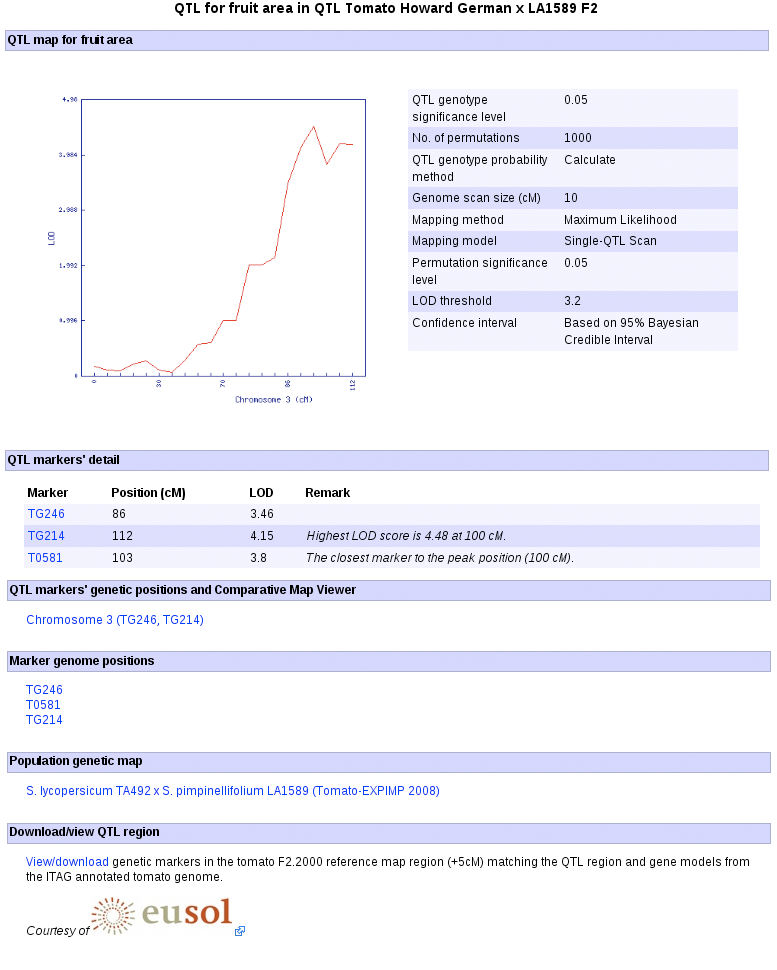 6. Clicking the "Go to the QTL page" generates the QTL detail page where among others the QTL confidence interval, links to the genome positions of the markers, marker detail pages, and SGN's Comparative Map Viewer are displayed.