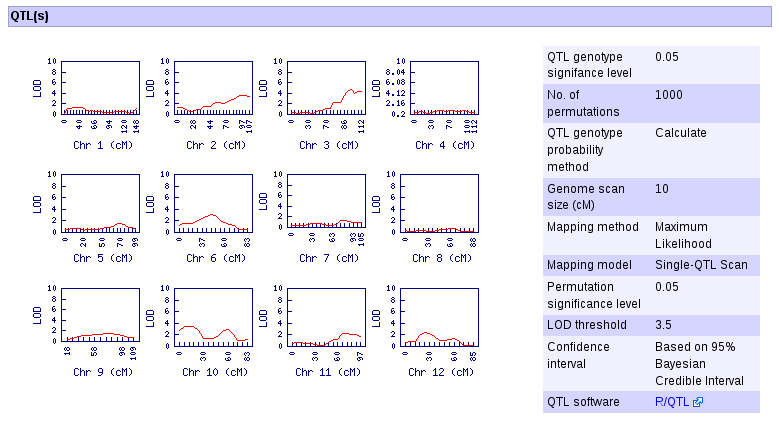 The QTL/Trait search returns phenotypic traits that may have qtl data. QTL analysis is performed on the fly.